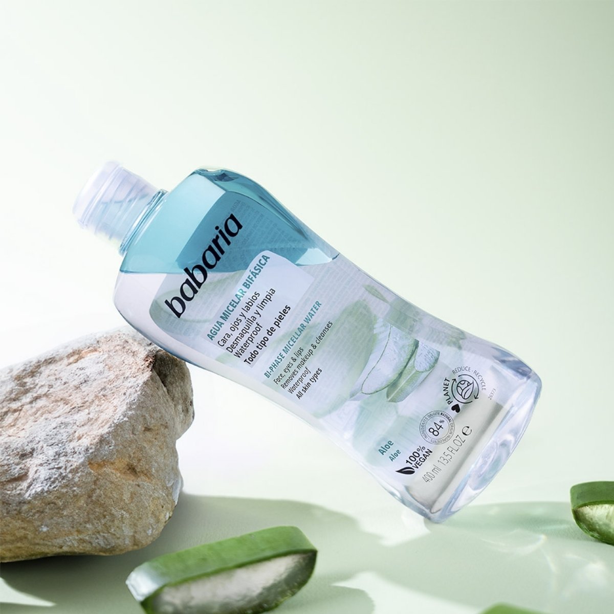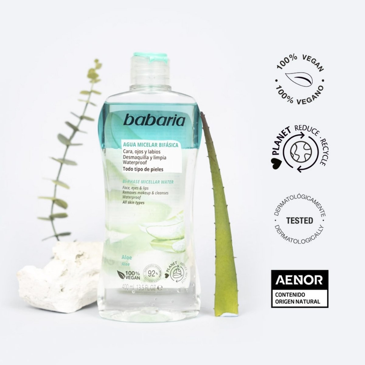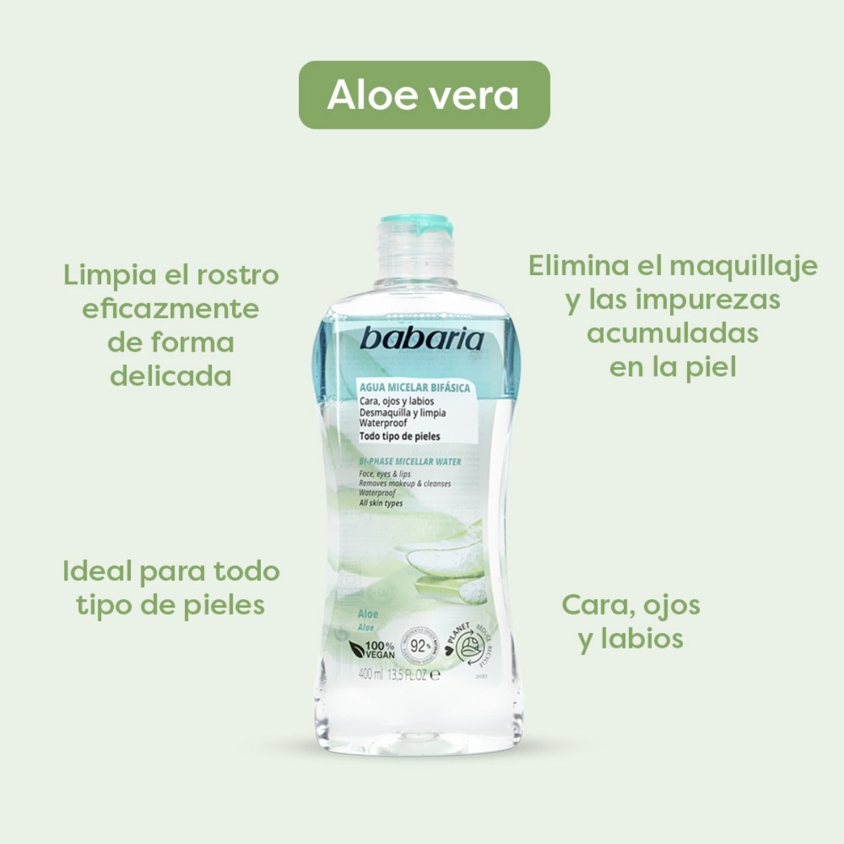 Limpia, desmaquilla e hidrata en un solo paso con agua micelar bifásica con aloe vera BABARIA, ideal para todo tipo de piel, incluso sensible. Elimina maquillaje resistente mientras aporta frescura y suavidad sin dejar residuos.