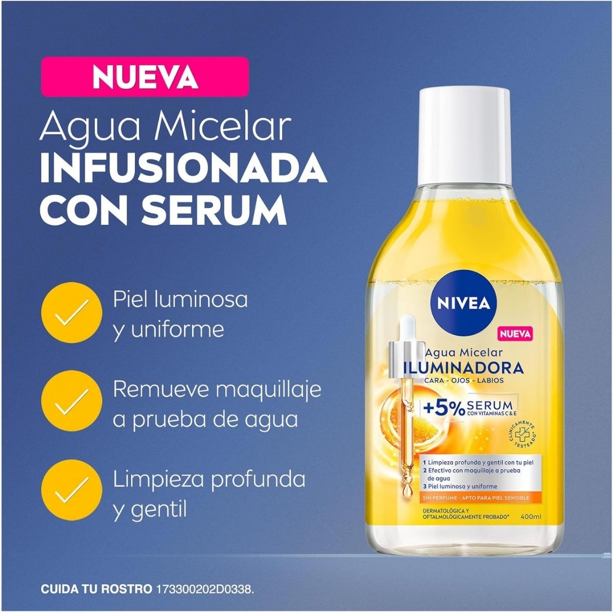 Agua micelar iluminadora NIVEA 400ml que limpia profundamente, elimina maquillaje y revitaliza la piel, dejándola radiante y fresca sin residuos.