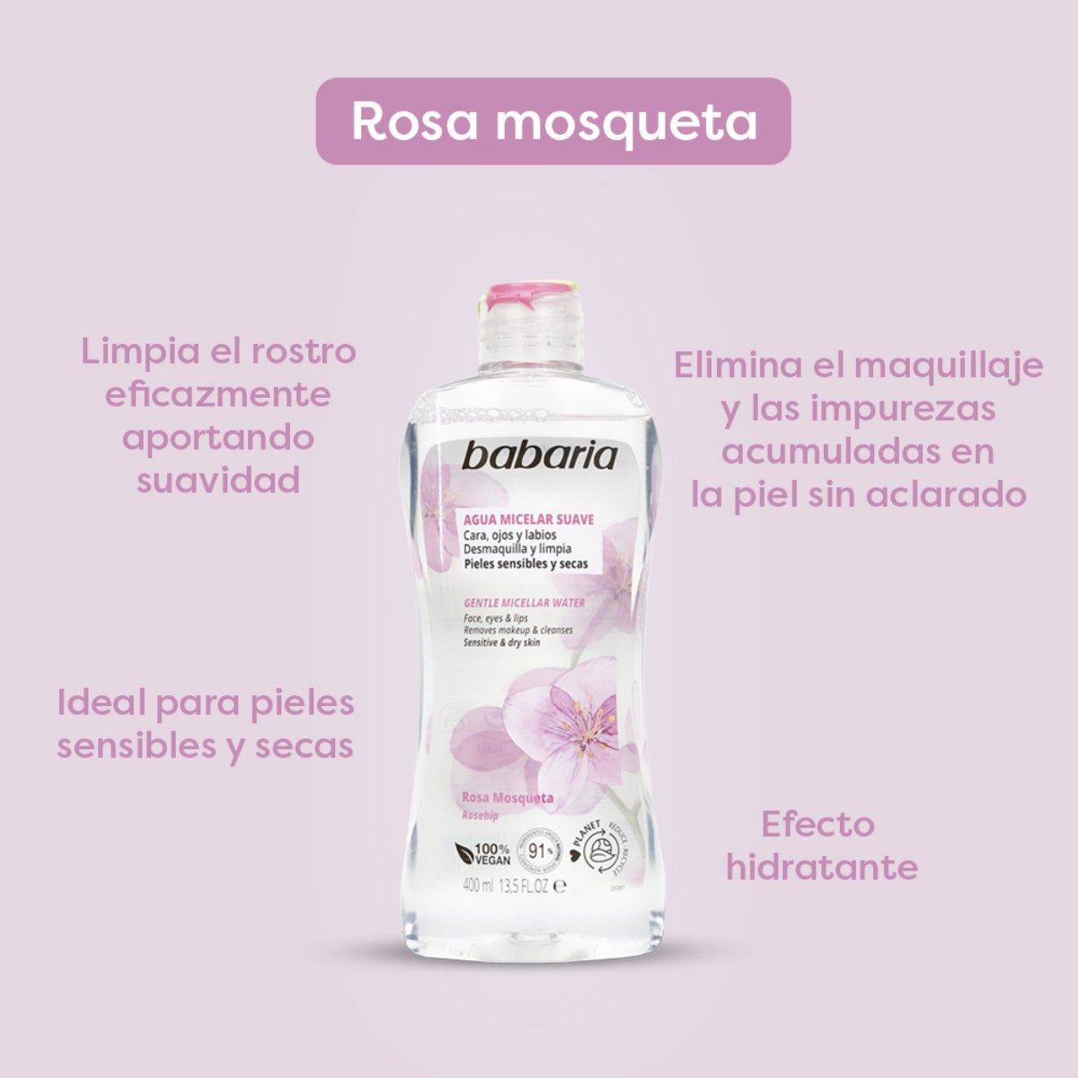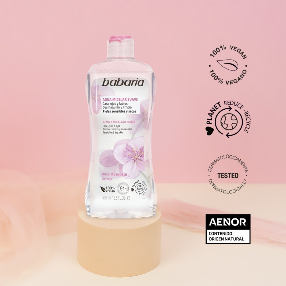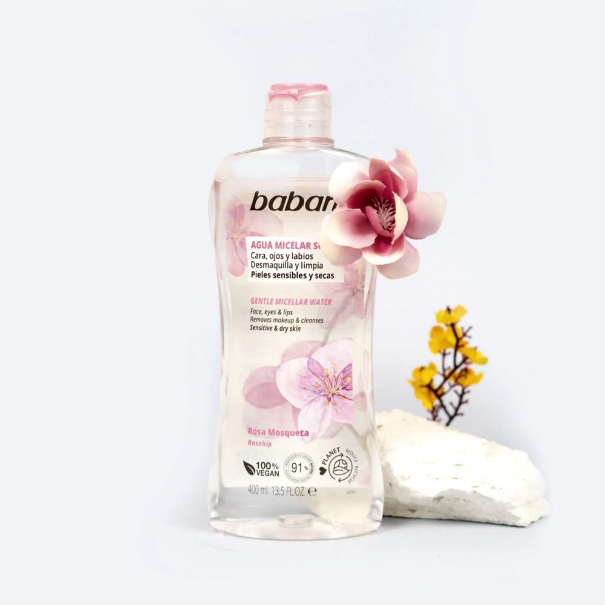 Agua micelar BABARIA con rosa mosqueta que limpia profundamente, hidrata y ayuda a mejorar la textura de la piel. Perfecta para pieles sensibles que buscan luminosidad y cuidado diario.