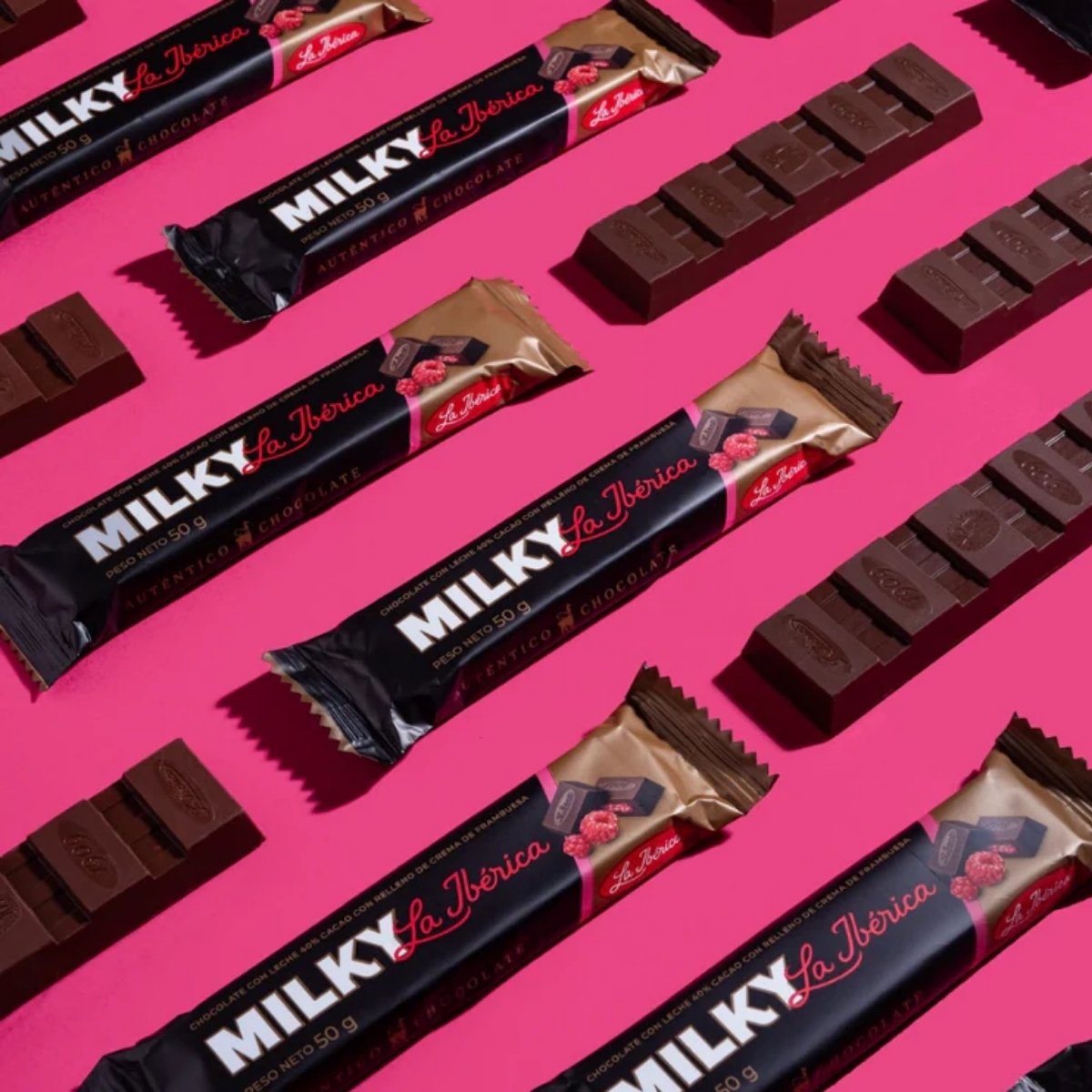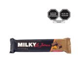 Barra Milky de CHOCOLATE LA IBERICA con relleno de crema de frambuesa, perfecta para un toque frutal y dulce.
