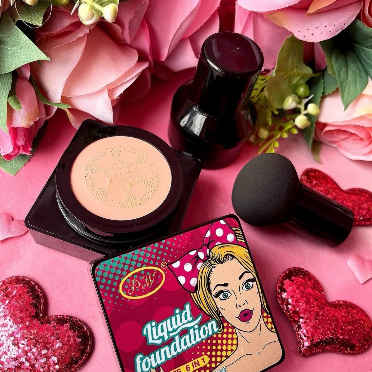 Base cushion P&W con tecnología coreana. Cobertura media modulable, acabado natural y efecto piel hidratada con aplicación uniforme.