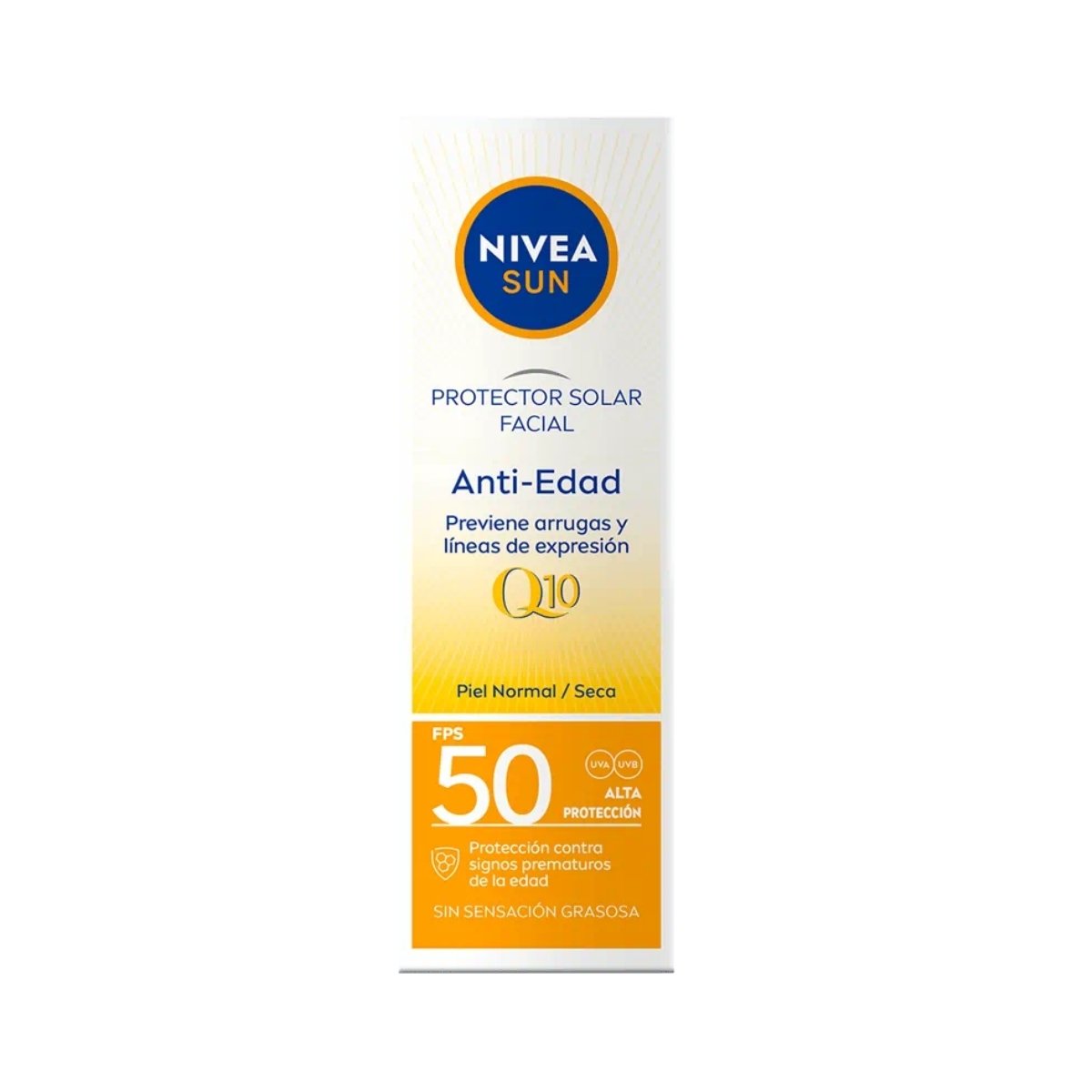 Protector solar facial NIVEA Q10 FPS 50 que combate los signos de envejecimiento mientras protege contra los rayos solares.