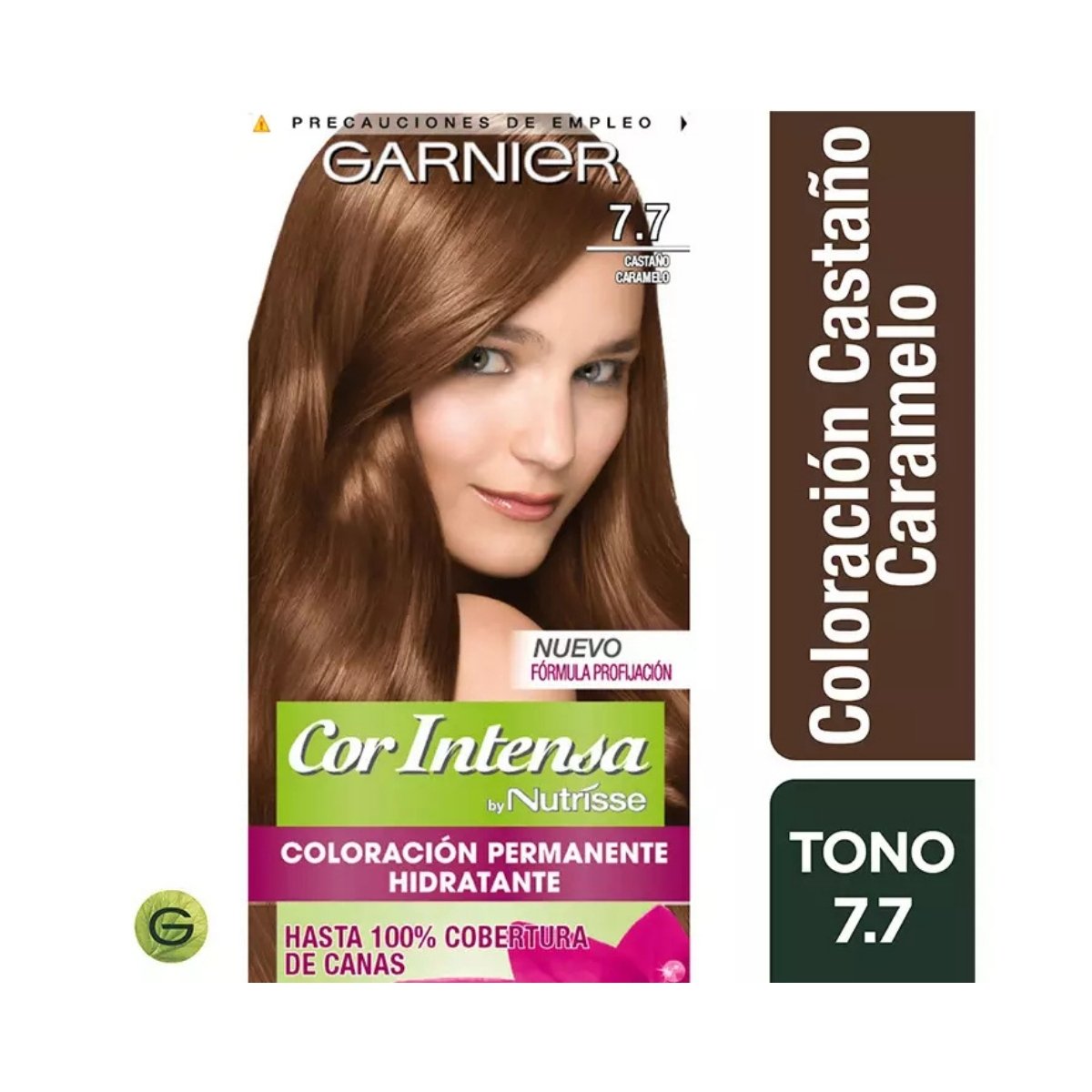 Coloración GARNIER castaño caramelo 7.7 con reflejos cálidos y brillantes, ideal para iluminar el cabello con un tono moderno y duradero.
