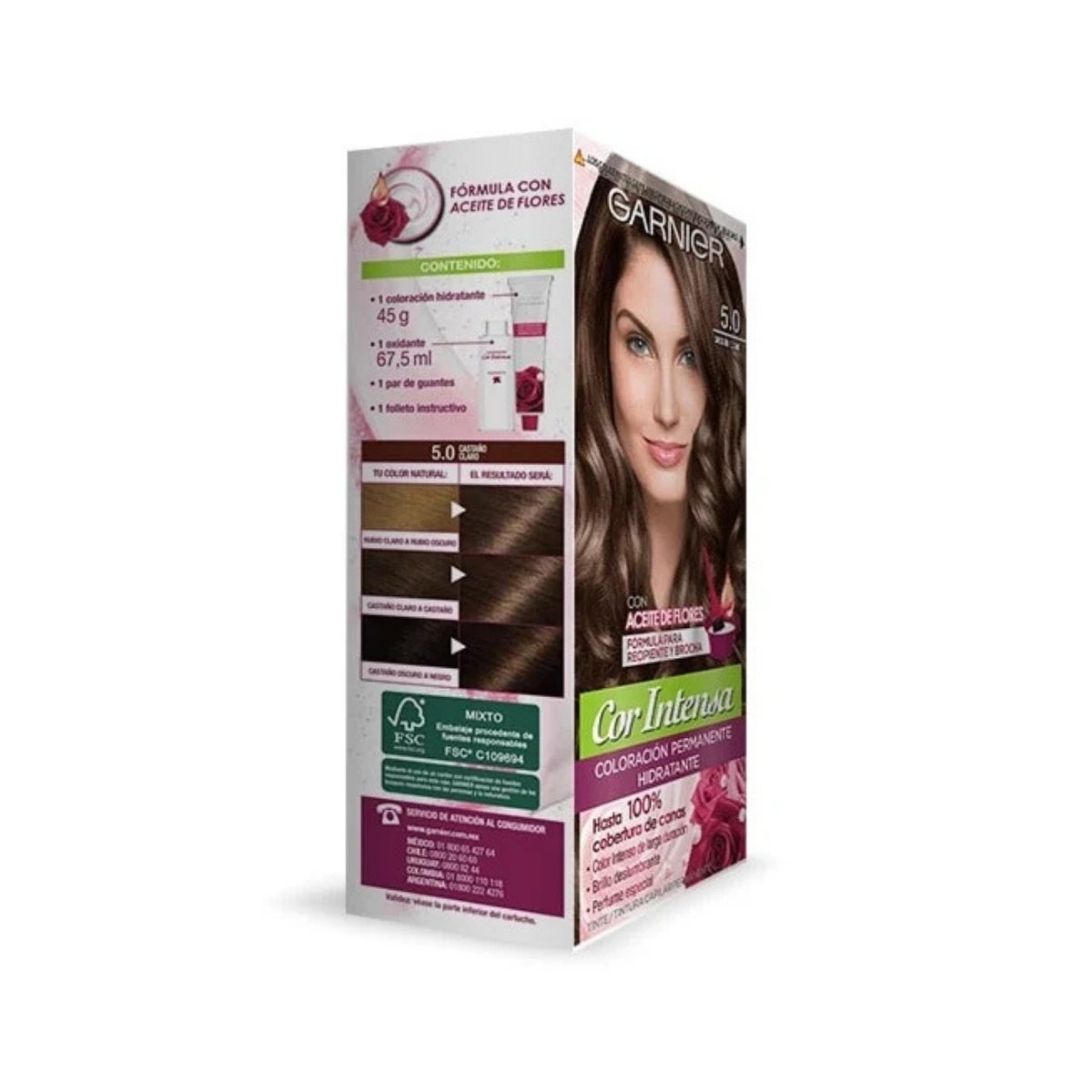Color GARNIER castaño claro 5.0 con cobertura total de canas y resultado natural, ideal para un look clásico y uniforme.
