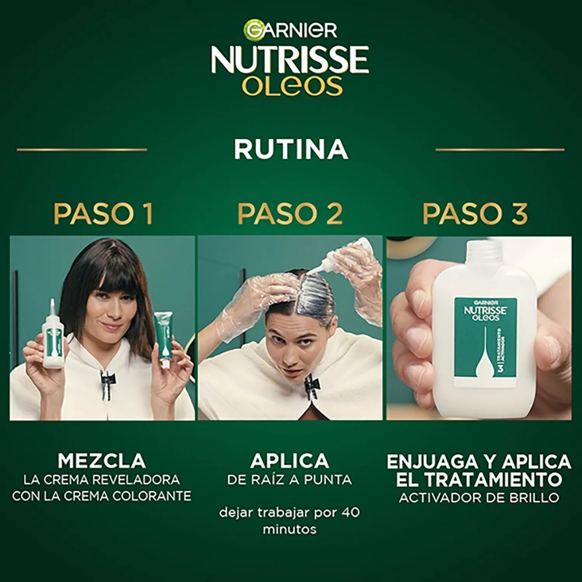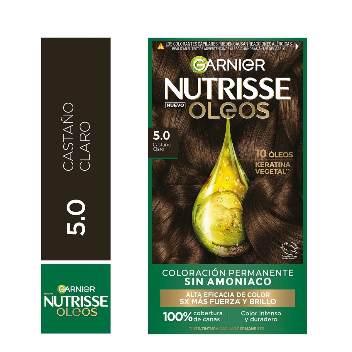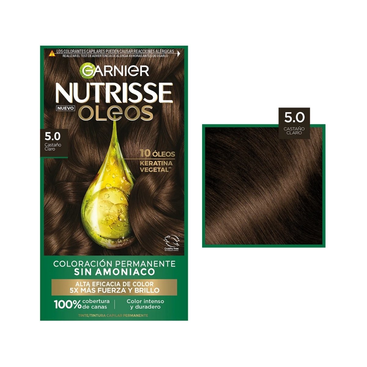 Tinte GARNIER castaño claro 5.0 sin amoníaco con aceites nutritivos, brinda color intenso, duradero y cabello visiblemente más saludable.