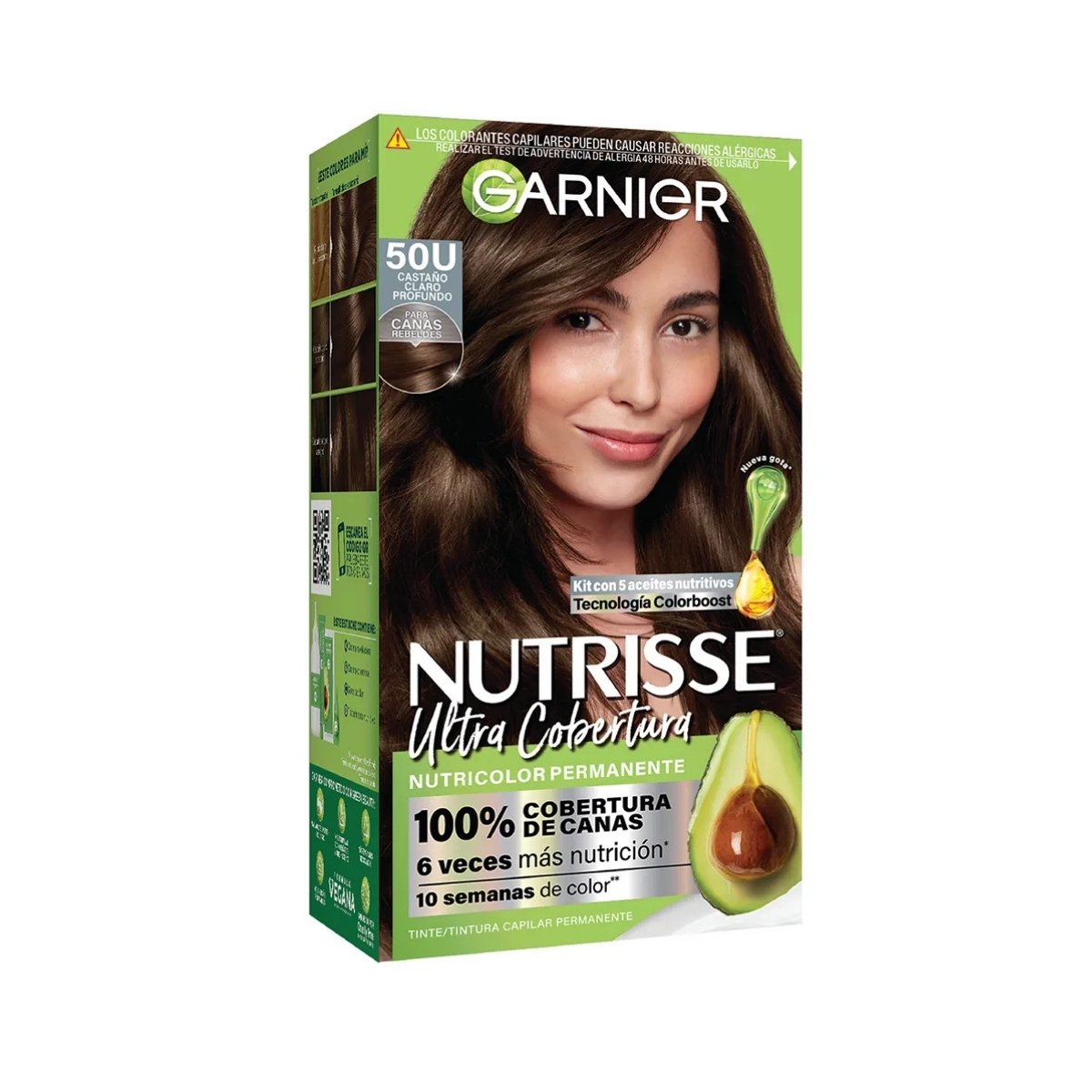 GARNIER Ultra Cobertura 50U en tono castaño claro profundo, ideal para un color intenso, duradero y con máxima cobertura de canas. Cabello nutrido y brillante desde la raíz.