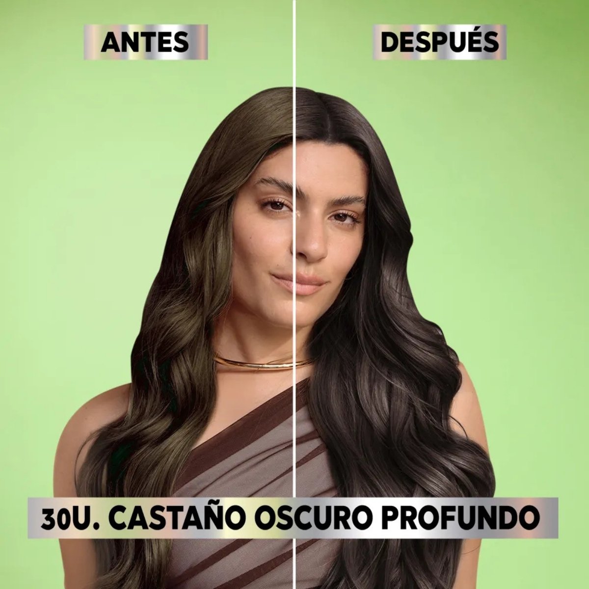 GARNIER Ultra Cobertura 30U ofrece un castaño oscuro profundo con máxima cobertura de canas y un acabado uniforme, intenso y duradero.