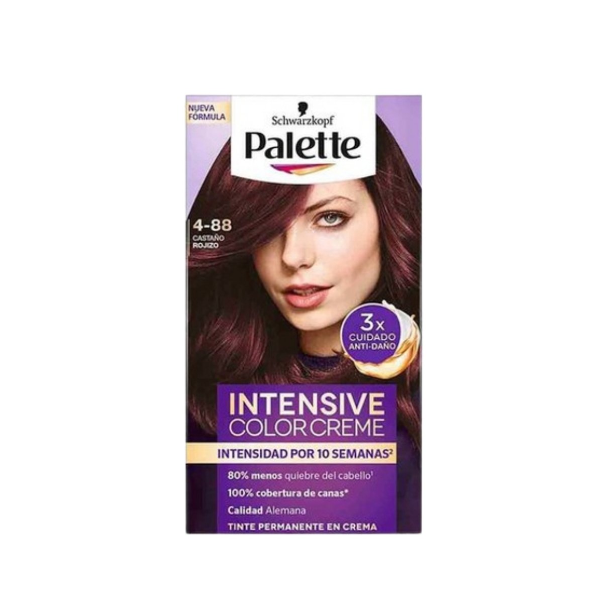 Luce un tono vibrante con el TINTE PALETTE Castaño Rojizo 4-88, con fórmula en crema que brinda cobertura total, intensidad de color y brillo duradero.