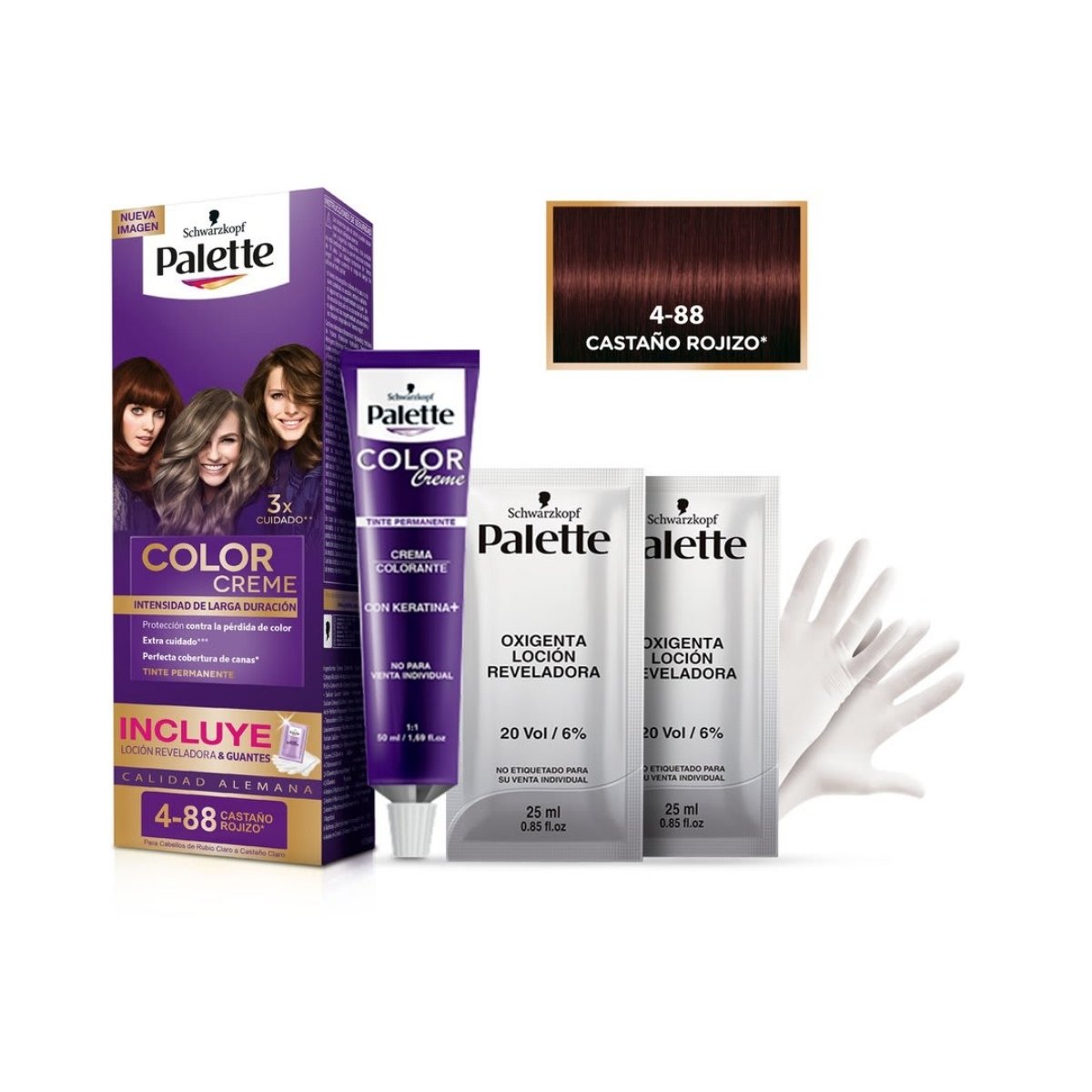Realza tu estilo con el TINTE PALETTE Castaño Rojizo 4-88 mini kit, perfecto para un acabado luminoso y uniforme desde casa.