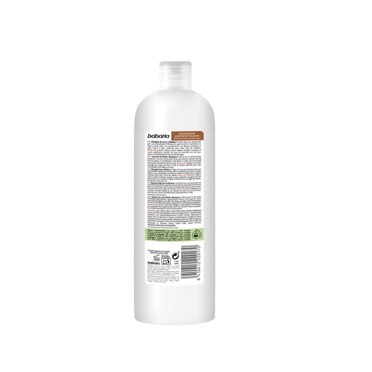 Nutre profundamente con champú BABARIA de coco y biotina, ideal para fortalecer, hidratar y dar brillo al cabello seco o debilitado.