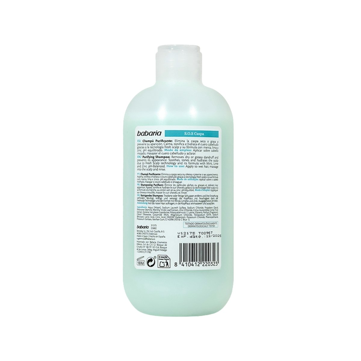 Limpieza profunda y control de caspa con champú purificante BABARIA, ideal para cuero cabelludo graso o con descamación.