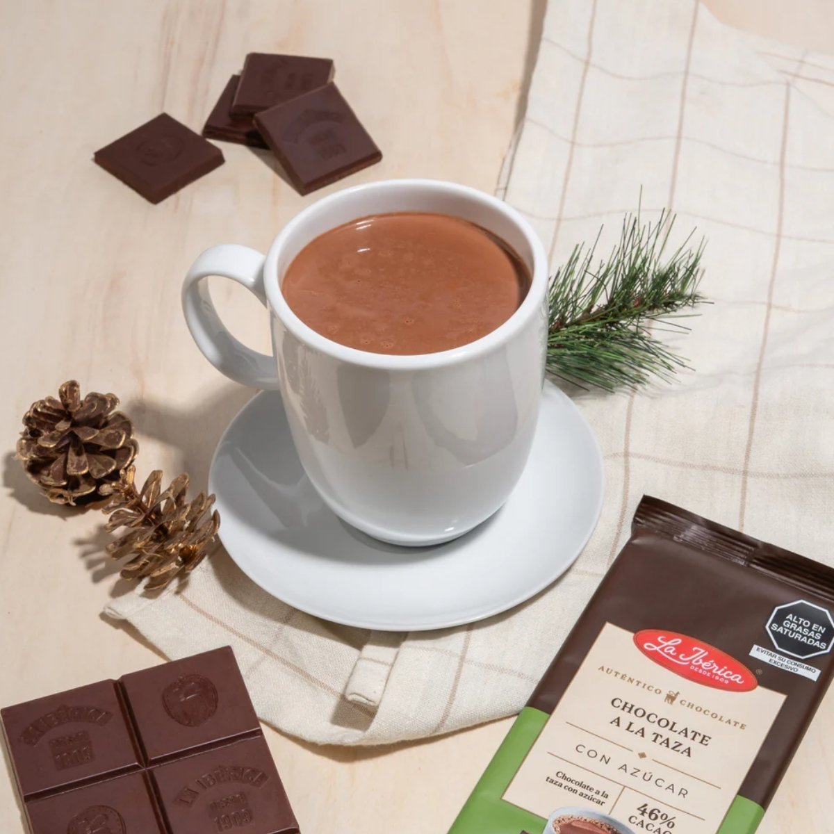 Tradicional chocolate a la taza de CHOCOLATE LA IBERICA con 46% cacao, perfecto para bebidas calientes cremosas.