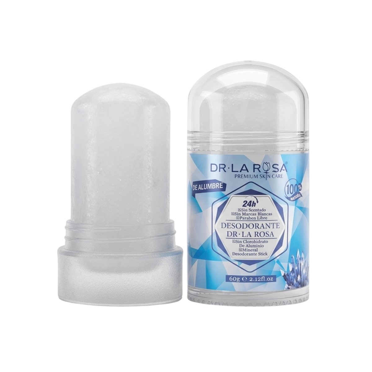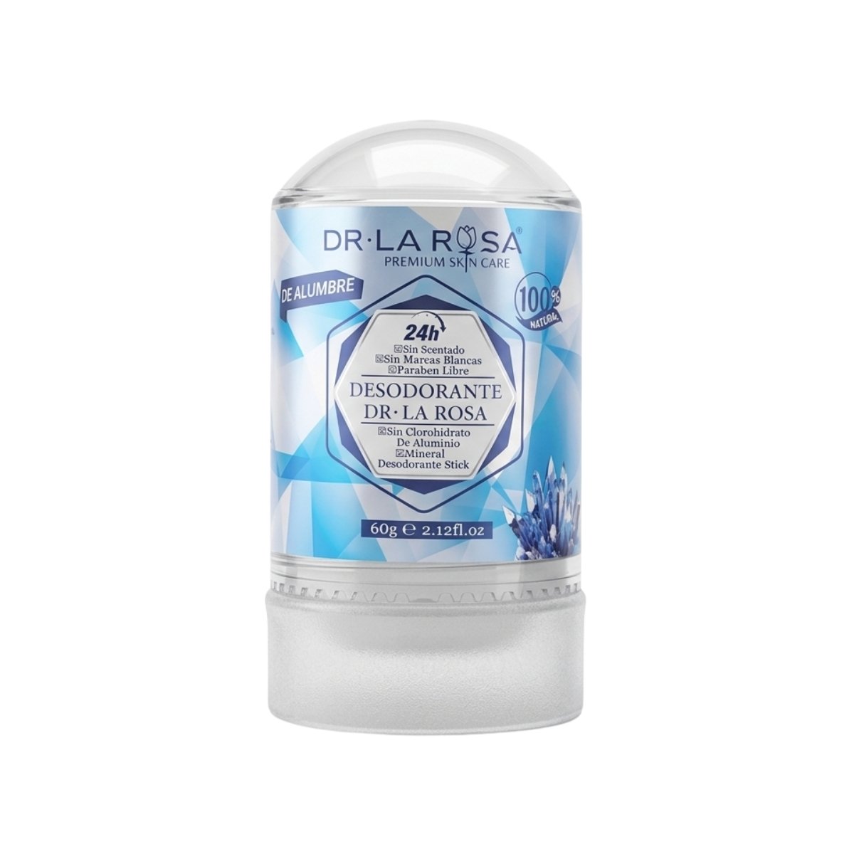 Desodorante natural DR.LA ROSA de alumbre celeste que controla el mal olor sin irritar la piel, ideal para uso diario.