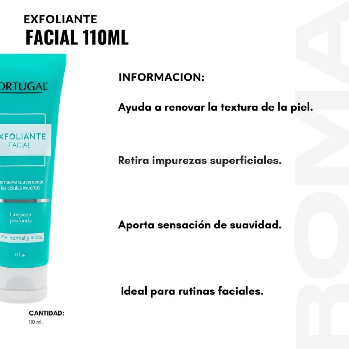 Exfoliante facial 110g PORTUGAL diseñado para remover células muertas, limpiar profundamente los poros y mejorar la textura de la piel. Perfecto para una rutina de cuidado facial que deja el rostro suave y luminoso.