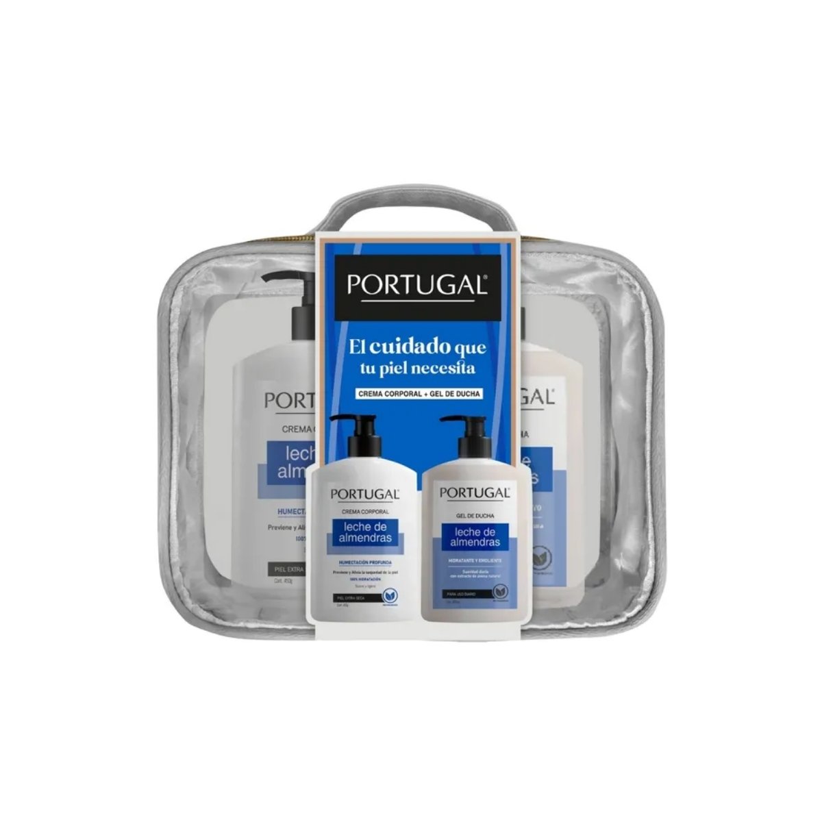 Set neceser PORTUGAL con crema corporal de leche de almendras 450g y gel de ducha 470ml. Proporciona hidratación intensa, limpieza suave y una sensación de frescura en la piel.