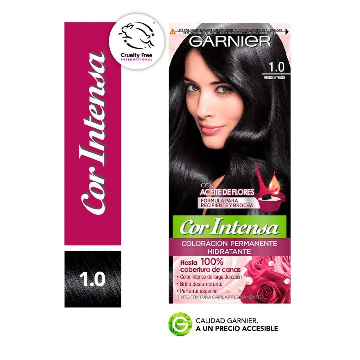 Color GARNIER negro intenso 1.0 con máxima pigmentación y brillo extremo.