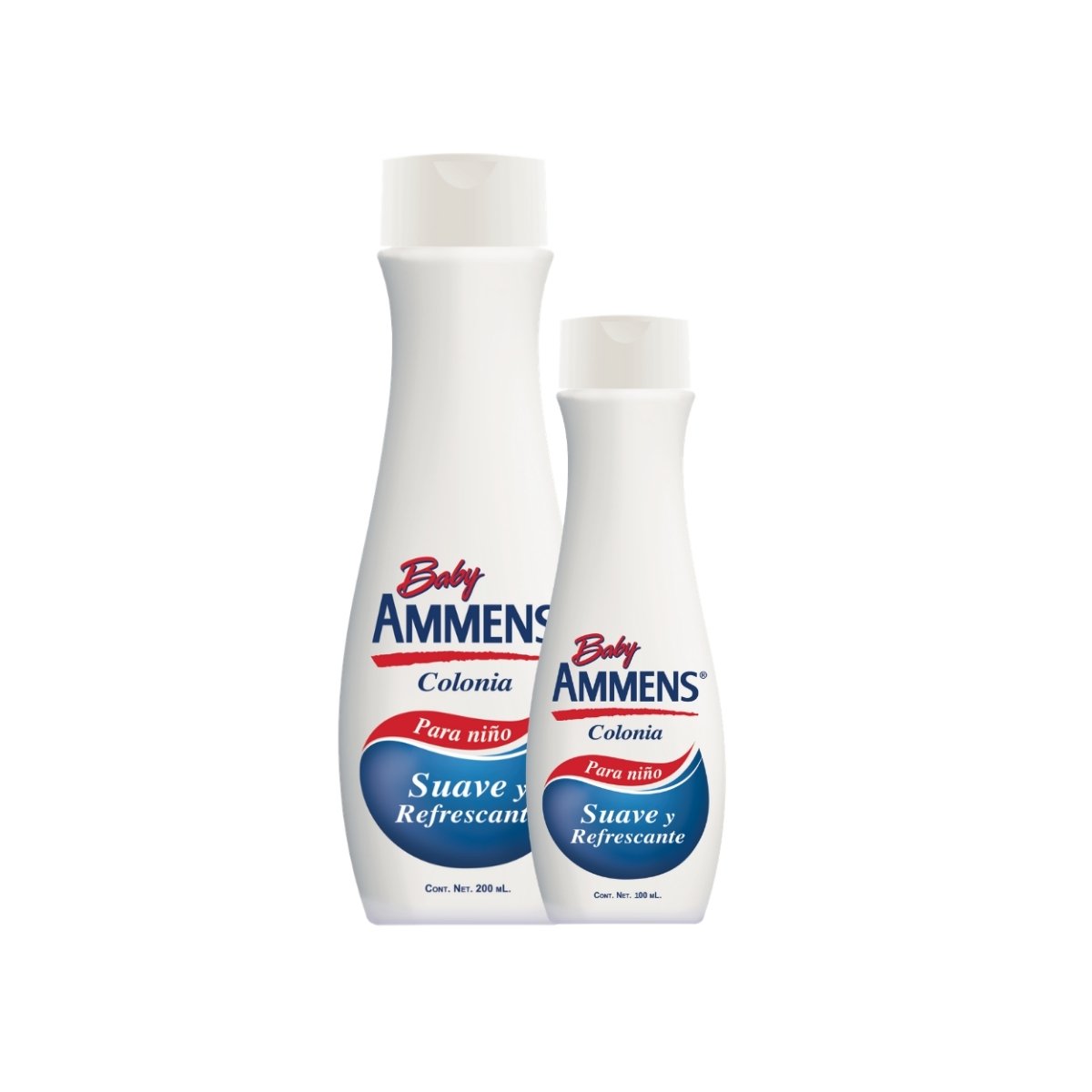 Pack colonia AMMENS Baby con presentaciones de 100ml y 200ml, ideal para el cuidado diario del bebé. Su fragancia suave y delicada brinda frescura y bienestar, perfecta para mantener la piel perfumada con ternura.