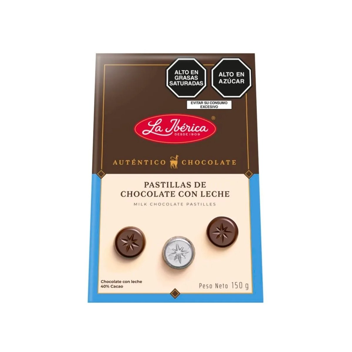 Pastillas de CHOCOLATE LA IBERICA sin azúcar con leche, ideales para un consumo equilibrado.