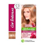 Tinte GARNIER rubio claro 8.0, clásico y luminoso, con cobertura uniforme y duradera.