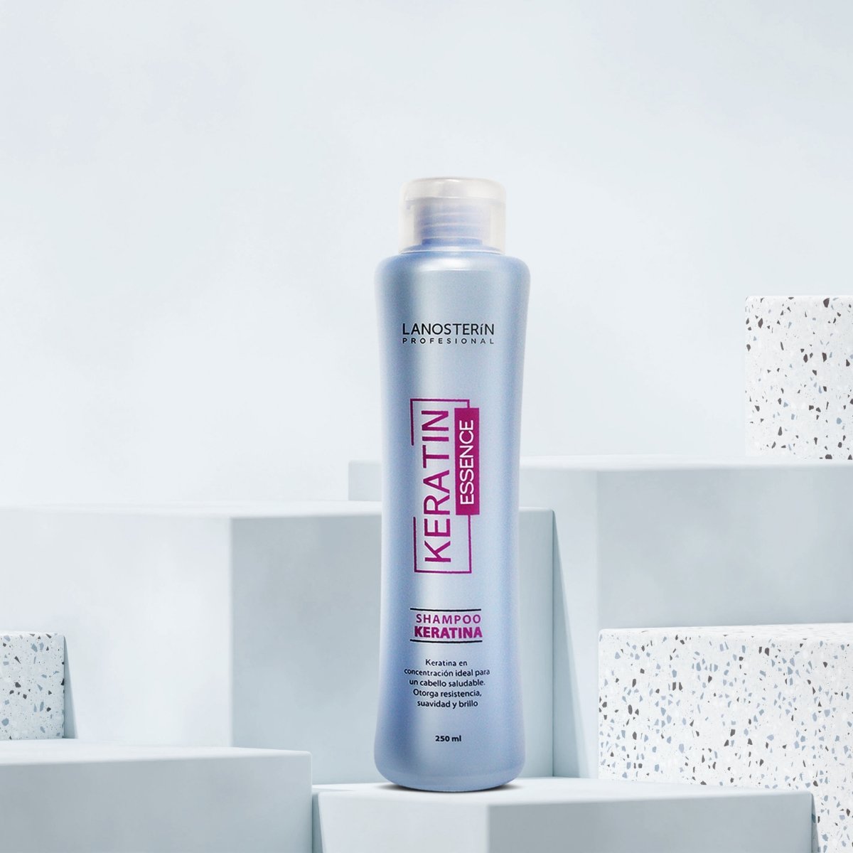 Shampoo KERATIN con keratina que fortalece y repara el cabello dañado.