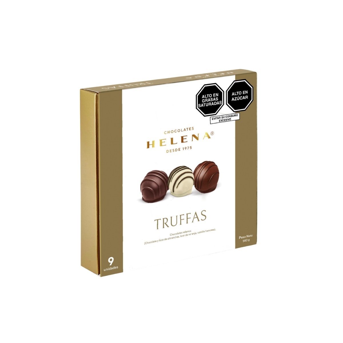 Caja de 9 trufas de CHOCOLATE HELENA, presentación elegante ideal para regalar o compartir en ocasiones especiales.